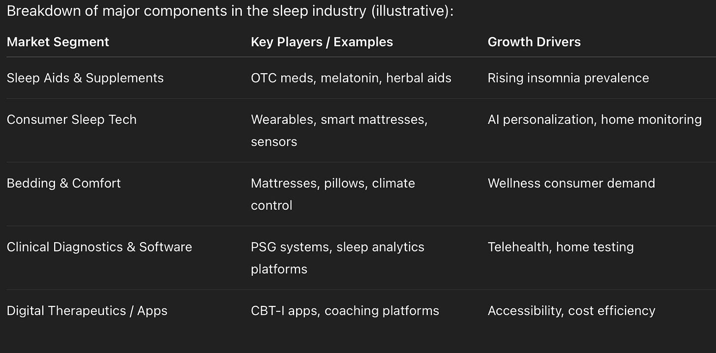Sleep used to be ignored in broader health markets â something only specialists cared about. Today, itâs a multi-billion-dollar global industry, driven by rising sleep disorders, heightened consumer awareness of sleepâs role in health, an influx of digital and AI-enabled technologies, and a growing number of treatment arms. The sleep market is no longer..sleepy.. itâs evolving into a broad health and wellness category poised for sustained growth, and closely followed by financial analysts and venture/tech funds.