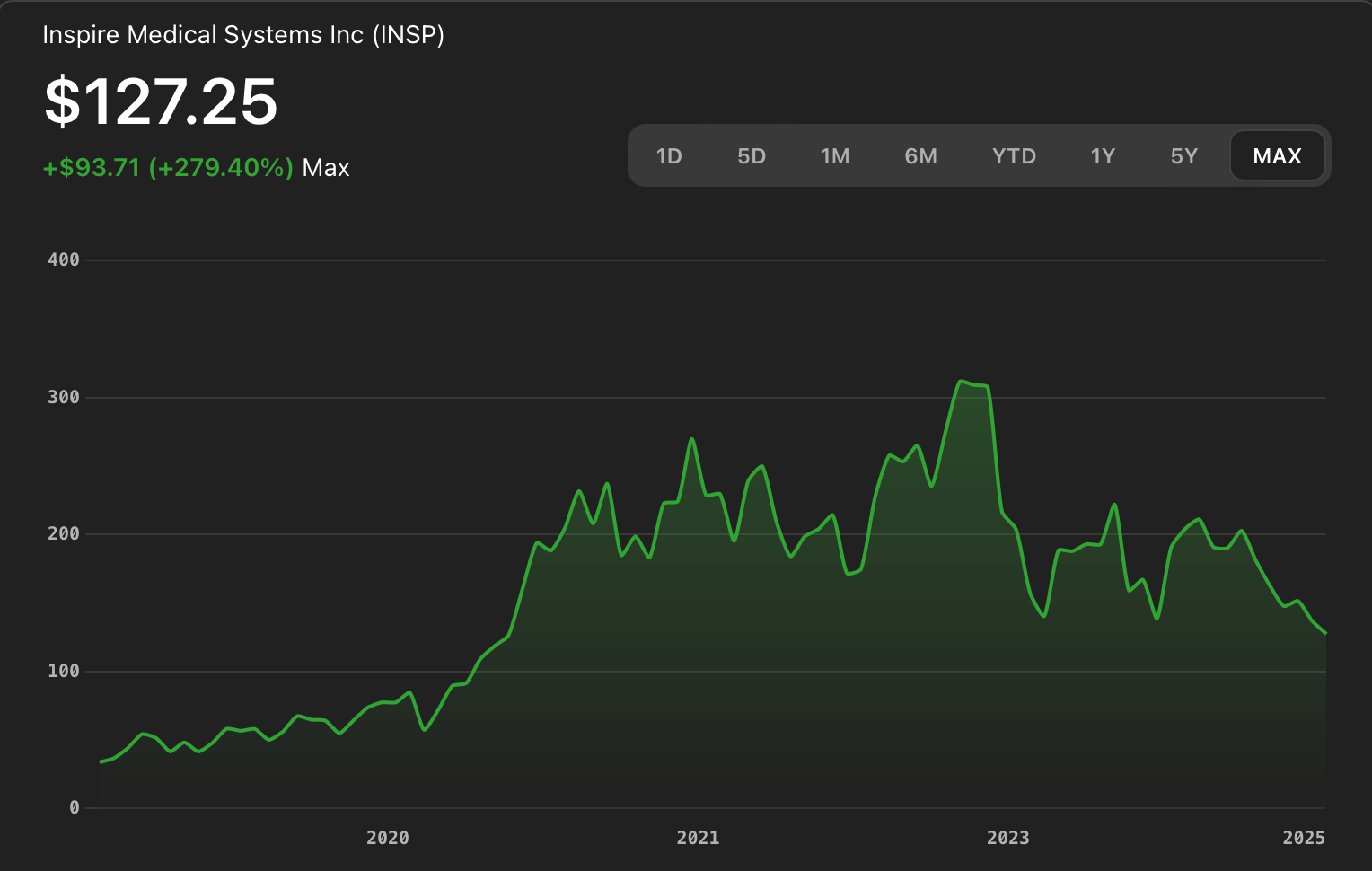 While Inspire continues to generate strong revenue and owns a monopoly in its surgical niche, its growth curve is flattening. Q1 2025 earnings were steady, but analysts were disappointed with cautious guidance. The stock is flat since 2022.