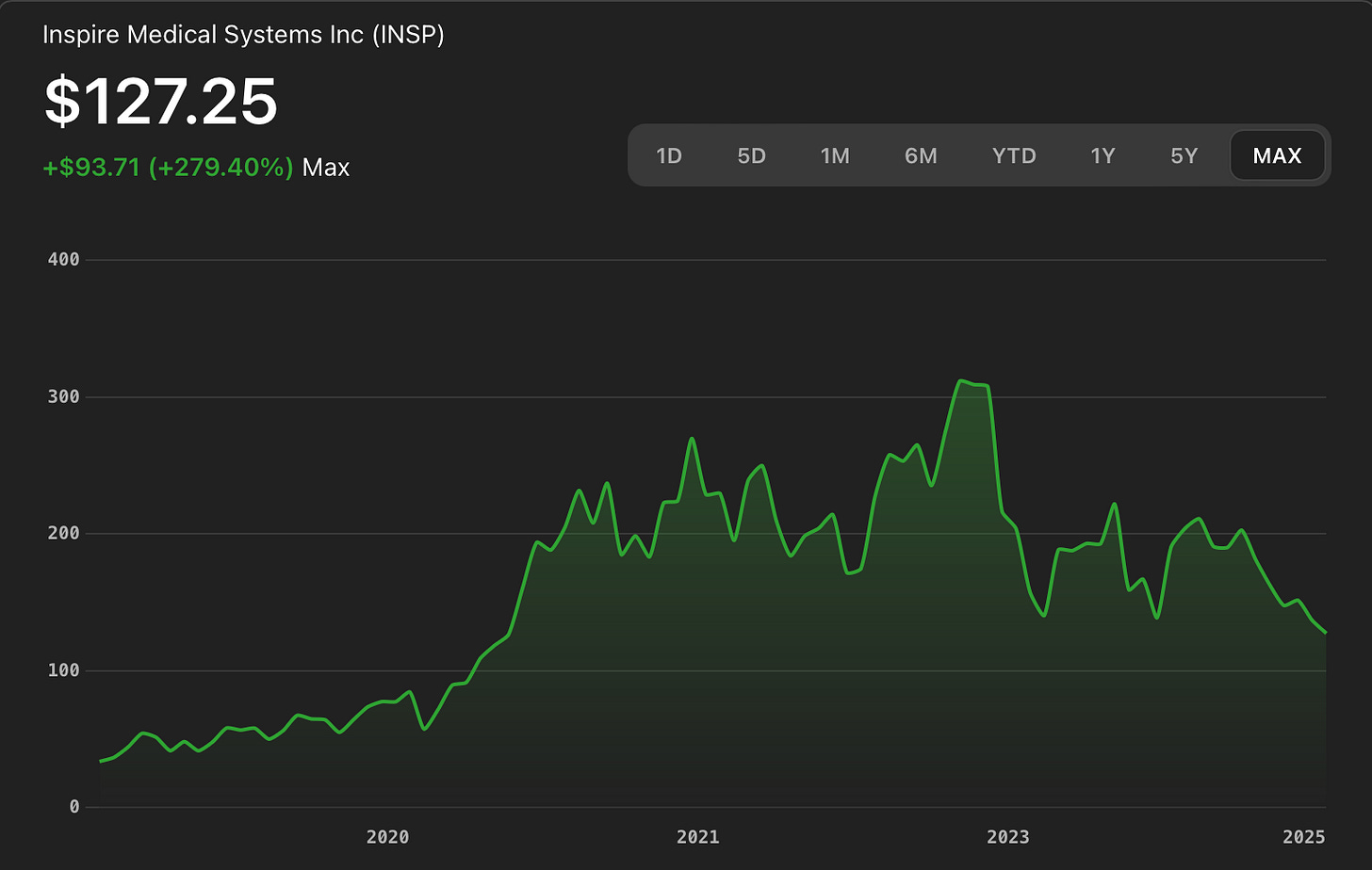 And Wall Street noticed. From its 2018 IPO through 2022, Inspire's stock price climbed from $24 to over $280 per share. It is one of the great medtech growth stories of the past decade. In many ways it represented the evolution of OSA as a boring disease of overweight males, to a multibillion dollar, venture-rich space essential to long-term health and qualify of life.